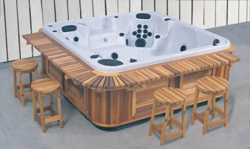 Detta paket med barer finns tillgängligt i olika storlekar för att passa alla våra spabads modeller. På bilden är det 2 stycken sidobarer samt en hörnbar för att vackert rama in ditt spabad. Stolarna säljs separat.